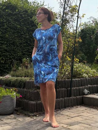 Šaty jsou rovného střihu. Jsou ušity z teplákoviny. Přední díl je z modrého potištěného úpletu. Na bocích mají šaty kapsy. Mají černé rukávy a záda, proto působí zeštíhlujícím dojmem.